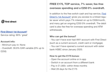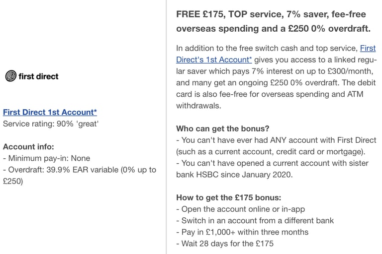 Una vez que tengas punto 1 y 2 completados puedes evaluar cual banco se adapta más a tus necesidades, o el que ofrezca más dinero para cambiarte, al momento de escribir este post - First Direct está pagando a los nuevos clientes £175 + £30 Amazon Voucher, ósea un total de £205 solo por abrir una cuenta con ellos.